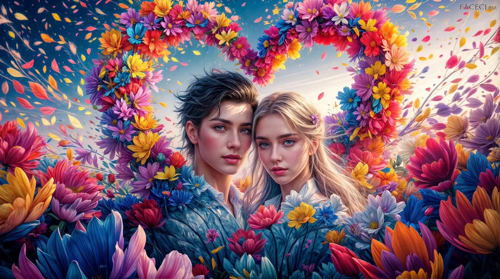 Grafika, Para, Kobieta, Mężczyzna, Serce, Kwiaty - faceci.biz
